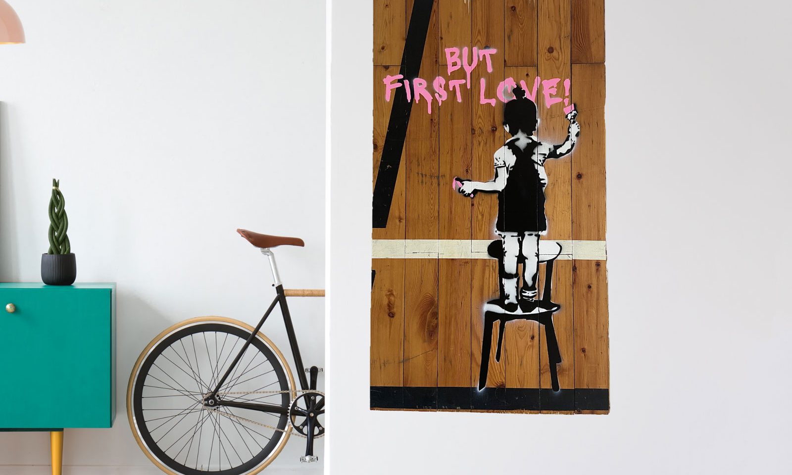 Auch bei den Handcut Stenciln ist das Material gebraucht. Hier verwende ich altes Sporthallenparkett, welches ich zufällig vor einer Tischtennishalle in Magdeburg vorfand. Ich war sofort schockverliebt in dessen Abnutzungs- und Gebrauchsspuren. Mir ist es hierbei wichtig, dass meine Bildmotive stets im Kontext zum verwendeten Material stehen – wie zum Beispiel der Turnschuh, der in einen Kaugummi tritt. Damit möchte ich die Besonderheiten und die eigenen Geschichten, die die Materialien bereits mit sich bringen, noch stärker hervorheben – aus scheinbar Unscheinbares aufmerksam machen.