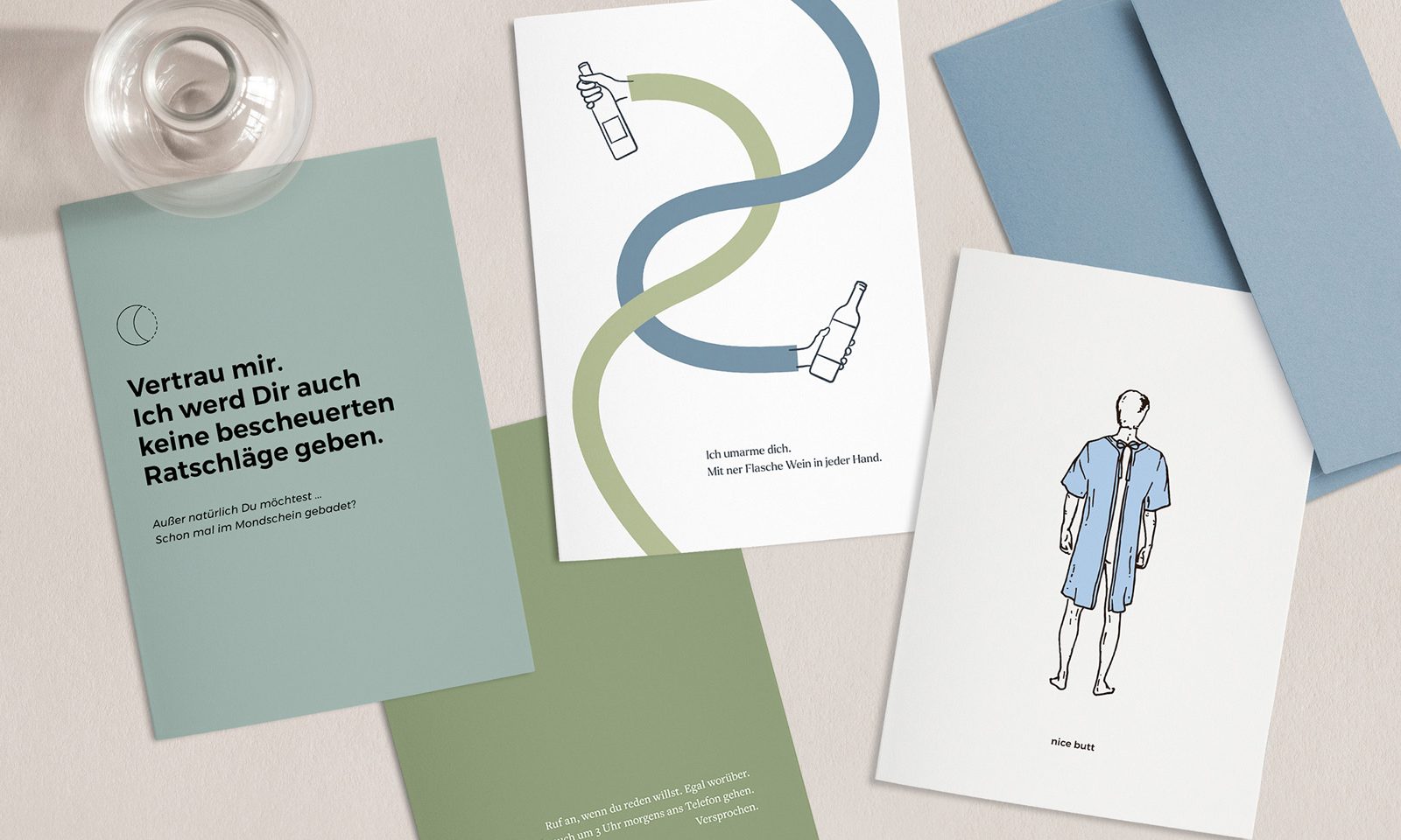 Unsere persönliche Erfahrung zum Thema Trauerkarten war geprägt von der Enttäuschung über das so wenig vielfältige Angebot. Der Gedanke war also schon länger da, dass man da »mal was machen müsste«. Die Pandemie spielte uns dann schlußendlich ein wenig in die Karten, weil wir einerseits als freie Designer gerade mehr Zeit hatten und sich andererseits auch die Wahrnehmung gegenüber »schweren Lebensphasen« verändert hat. Der Need nach treffenden Texten und ansprechenden Designs wurde deutlicher.