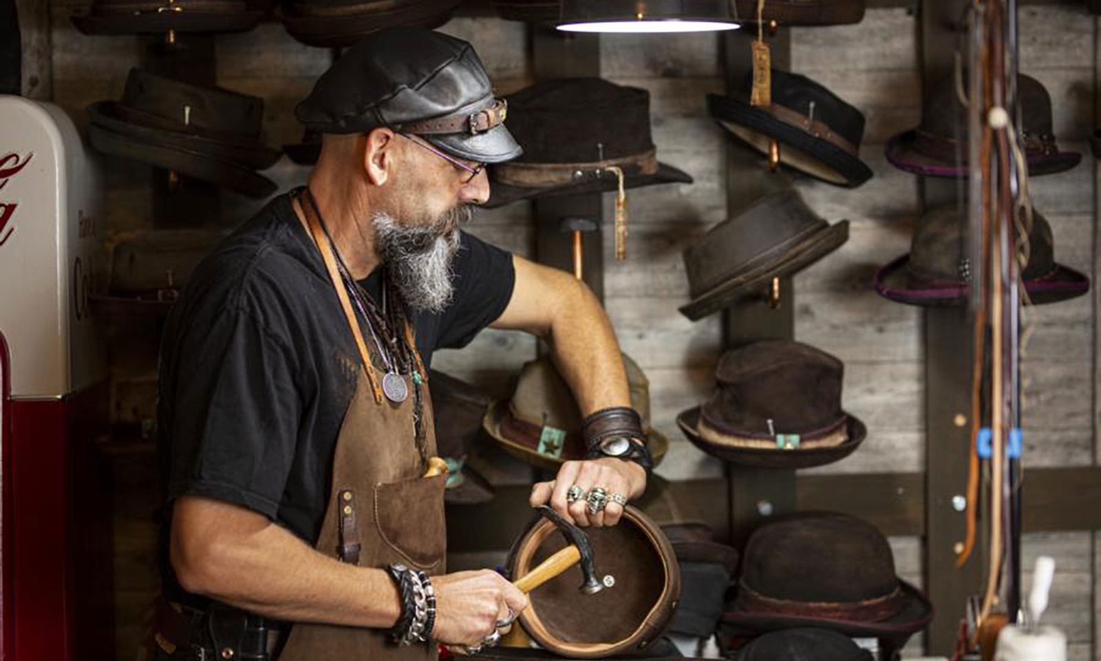 Es ist eine Lederwerkstatt, die neue Leder zu außergewöhnlichen Kopfbedeckungen im Used- und Vintage-Style, in Einzelanfertigung und mit Liebe zum Detail fertigt.